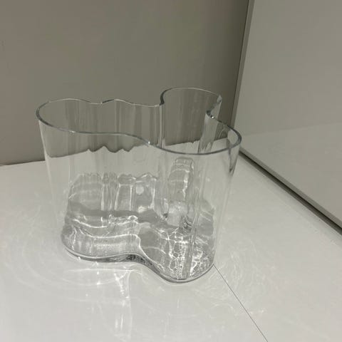 Riihimäen lasi, Helena Tynell maljakko kirkasta lasia. Maljakolla on neljä lohkoa, jotka muodostavat yhtenäisen muodon. Sopii kukkien ja koriste-esineiden esillepanoon. Materiaali lasi, väri kirkas.
