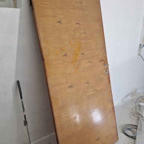 Vanhat ovenkarmit sekä vanhoja valkoisia sisäovia, jotka ovat myös kuvassa
