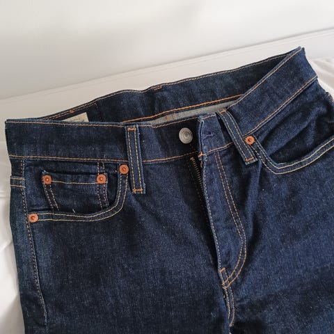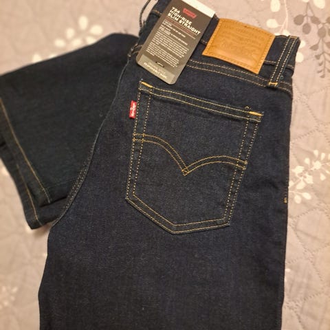 Farkut v.sininen. Modernit korkeavyötäröiset Farkut kapealinjaisella slim fit-istuvuudella. Kuin uusi.