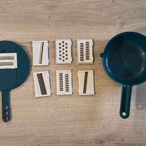 Multi-functional kitchen tool with interchangeable blades for slicing, grating, and dicing. Includes bowl, handle, and multiple attachments. Made from durable PP plastic, easy to clean.