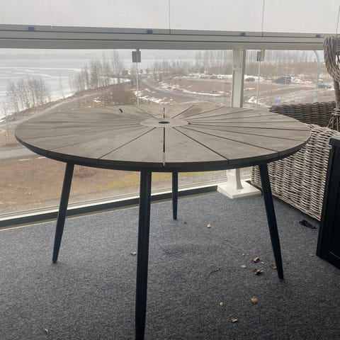 Reilun kokoinen, pyöreä pöytä terassille, halkaisija 145 cm, harmaa väri. Pöydän pinta on kestävää materiaalia, joka muistuttaa puun pintaa. Pöydän korkeus noin 71 cm. Soveltuu ulkokäyttöön. Ympärille mahtuu vähintään 6 ruokailijaa. Ollut meillä koko ajan lasitetulla terassilla säältä suojassa. Nouto Siivikkalasta, Ylöjärveltä. Jalat voi irroittaa kuljetuksen ajaksi.