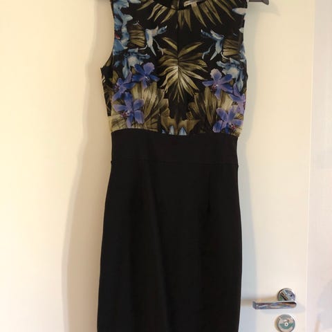 Mango midimittainen viskoosimekko puhvihihoin, koko M. Piilovetoketju ja vyötäröllä nauhat joilla saa säädettyä tyköistuvuutta.