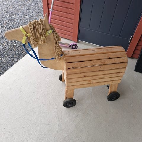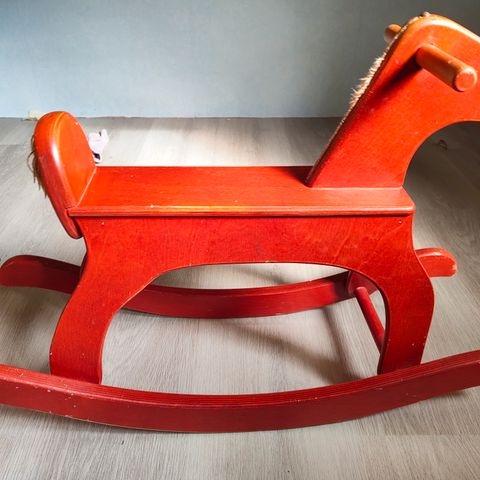 Hevonen ikään kuin laukkaa, kun sitä vetää. Pienoista käytön jälkeä on paikoin havaittavissa, mutta yleisilmeeltään siisti.