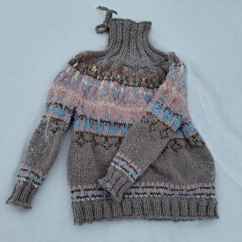 Naisten Ohdakeneulepaita koossa XL, valkoisella pohjavärillä ja kirjoneulekuviolla yläosassa. Valmistettu pehmeästä materiaalista, sopii viileisiin säihin ja arkipukeutumiseen. Lanka Novitan Moomi ja Kajastus, 75% villaa ja 25% polyamidi. Olkapää-helma 65 cm, Kai-kai 60 cm, kainalo-helma 40 cm, kainalo-ranne 47 cm. Käsin ommeltu, uusi neule.