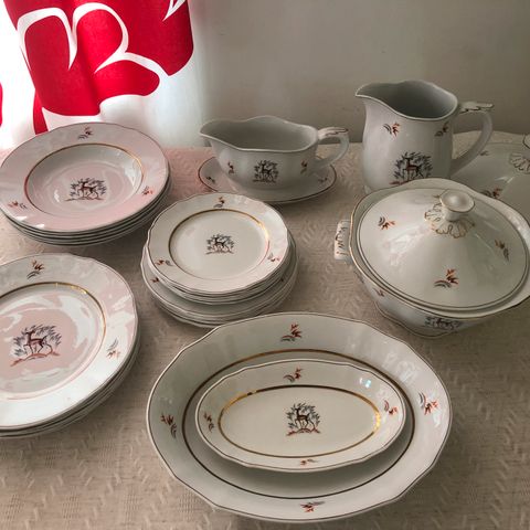 Arabian Kauris astiaston syvät lautaset ja tarjoiluosat, mm. kannu, liemikulho ja kastikekaadin. Suunnittelija Tyra Lungren. Saatu häälahjaksi 40-luvulla. Erittäin vähäisiä käytön jälkiä. Hinta kaikista osista yhteensä.