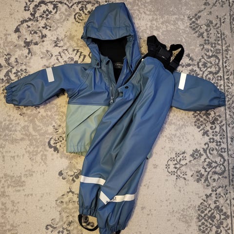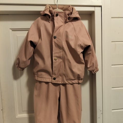 Fleece vuoratut sadehousut ja sadetakki. Pientä kuravärjäytymää, pepussa nirhauma, jossa meillä ollut heijastin tähti paikkatarra, tämä kuitenkn irtosi pesussa ja jäi tarran liima (tästä lisäkuva). Muuten ehjä ja siisti kunto.