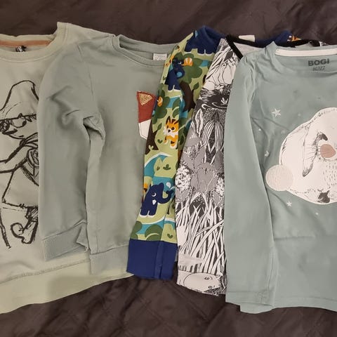 Paitapaketti, koko 116. Merkkeinä Ommellinen, Lindex, Marimekko.