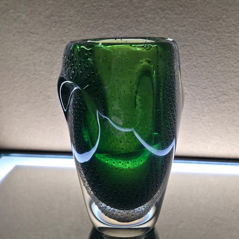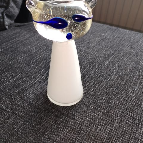 Kissa lasipatsas, jossa valkoinen ja kirkas lasi. Koriste-esine, joka sopii sisustukseen. Korkeus noin 15 cm