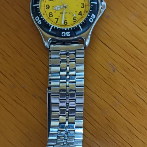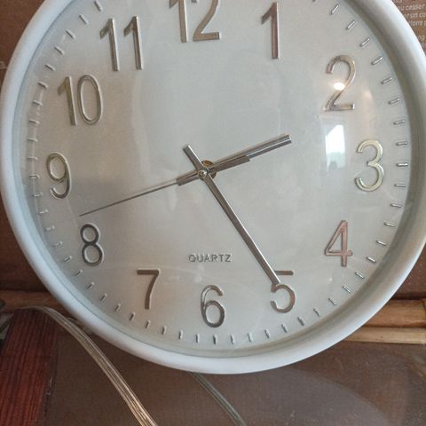Kuvien mukainen kello. Patteri lienee loppu. Lasin päällä muovi niin ei taida olla kovin vanha. Kokonaispituus 23 cm
