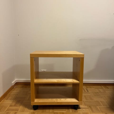 Uusi retrotyylinen puinen yöpöytä laatikolla ja avoimella hyllyllä