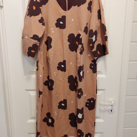 Marimekon Pekaani Ruusuruutu pellavamekko. Ruskealla pohjalla valkoisia kuvioita, lyhyet hihat ja kaunis tilaa antava laskos selässä. Koko 44. Kangas ei jousta Kai-kai 66cm, olka-helma 96cm. Erinomainen kunto.