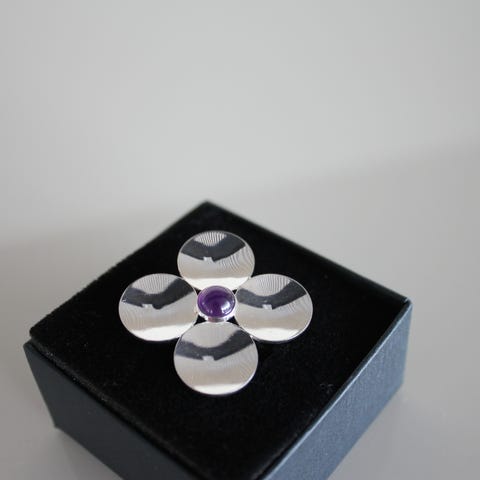 Myydään kaunis rintakoru, rintaneula, solki, hopeaa. Kivi oletettavasti spektroliitti. Leimat: Suomen tarkastusleima, 925 hopeaa, N8 vuodelta 1990. Korun halkaisija 27 mm. Paino 10,3 g. Kiinnitysneula ehjä ja toimiva, varmuuslukko. Koru on hyväkuntoinen.