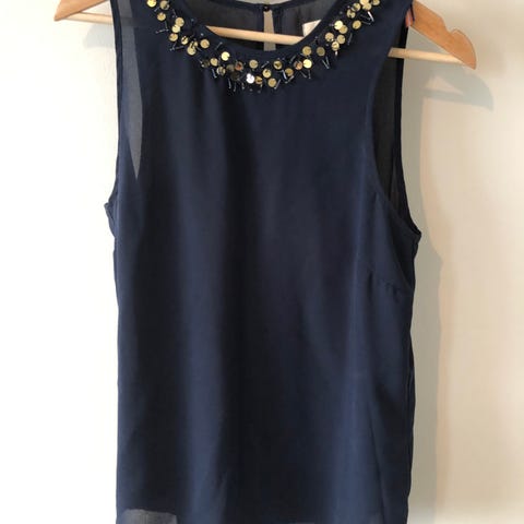 Laivastonsininen toppi. Etuosa ohutta ja hieman läpinäkyvää materiaalia, takaosa paksumpaa materiaalia. Käytetty muutaman kerran.