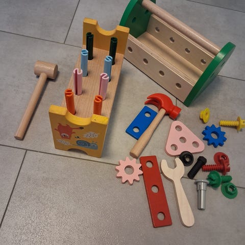 Upea lahjapakkaus täynnä työkaluja! Suuren vasaran muotoisen pakkauksen sisällä voit säilyttää työkalut! Pakkauksessa on kaikki tarvittavat käsityökalut, mukaan lukien paristokäyttöinen ruuviväännin.
