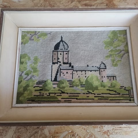 Ristipistotyö kehyksissä. Ulkomitat noin 33,5x40cm. Kehyksissä on pieniä naarmuja paljon.