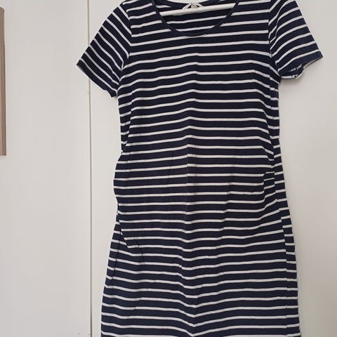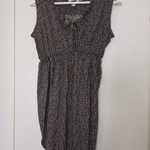 Hyväkuntoinen äitiysmekko/tunika. Erillinen vyö mukana, sille ei ole erikseen ripustuslenkkejä. Edessä neljä nappia. Vajaamittaiset hihat.