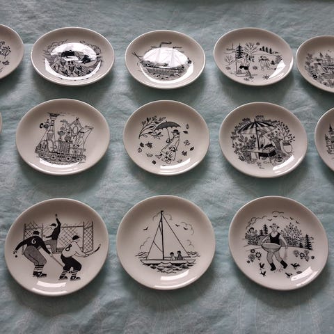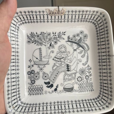 Myydään Arabia Emilia / Raija Uosikkinen pieni seinälautanen. Kunto ehjä, painokuva hieman epätarkka (II-laatu?). Pieni nirhauma sivussa, joka näkyy kuvassa 4.