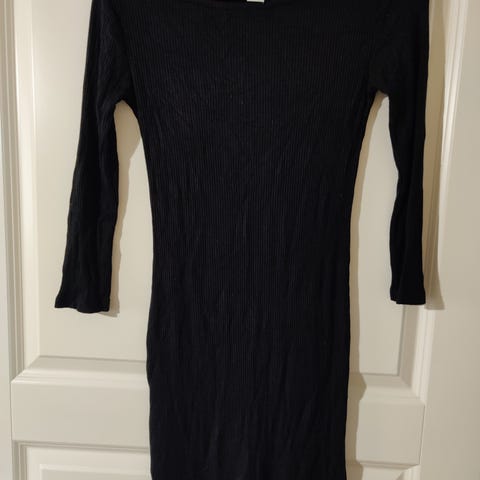 Mustavalkoinen trikoomekko vyöllä, kokoa XS. Käytetty vain pari kertaa, pesty hajusteettomalla pesuaineella. Puhdas ja ehjä.