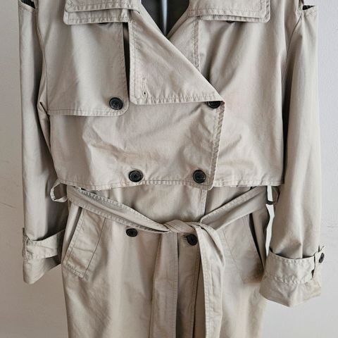 NA-KD Pitkä takki beige värissä, naisten koko 34 (oversized). Takki on pitkä malliltaan ja siinä on vyötäröllä solmittava vyö, sekä mustat yksityiskohdat edessä. Materiaalista ei ole tarkempaa tietoa.