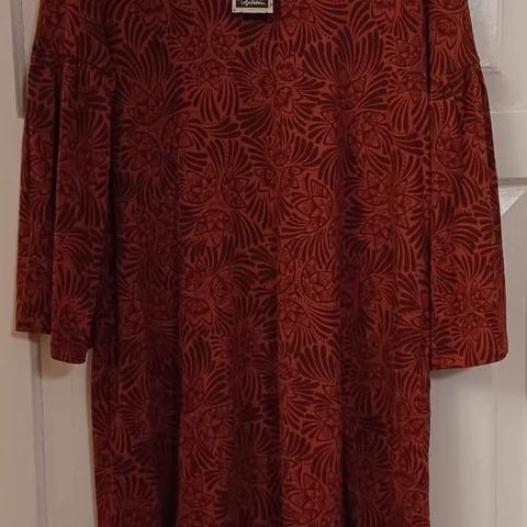Aivan ihana Gudrunin tunikamekko myyntiin. Pahoittelut huonoista kuvista, kamera temppuili - pyydä tarvittaessa lisäkuvia. Kauniin mausteiset, syksyiset värit. Äärettömän kiva malli 3/4 -osa hihoilla ja erikoisella helmalla. Tästä tulee helposti lempivaate.