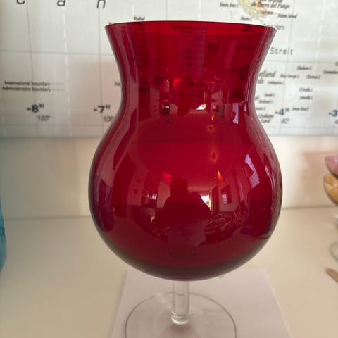 Harvinaisempi rubiinin punainen ja kirkas lasi. Hiottu yläreuna. K 23,7.