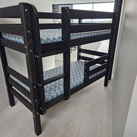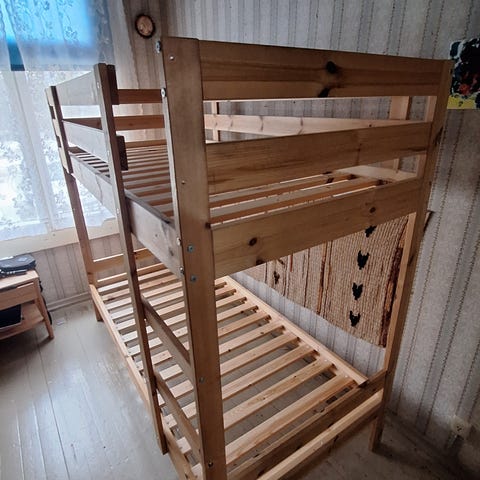 Valkoinen, metallirunkoinen kerrossänky. Patjakoko 90x200. Käytön jälkiä lähinnä tarroista jotka putsattavissa.
