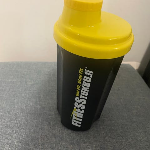 Mustasta muovista valmistettu shaker-pullo, jossa on kiinnitettävä kansi ja juomareikä. Pullo soveltuu nesteiden sekoittamiseen ja kuljettamiseen, esimerkiksi proteiinijuomille tai muille ravintolisille.