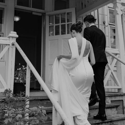 Evelyn-häämekko on ihanan minimalistinen ja elegantti. Siinä on kauniit yksityiskohdat. Mekko tuntuu päällä kevyeltä ja laskeutuu kauniisti.