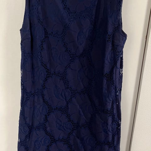 Laivastonsininen juhlava pitsimekko. Materiaalilappu leikattu pois kankaan läpinäkyvyyden takia. Käytetty muutaman kerran.