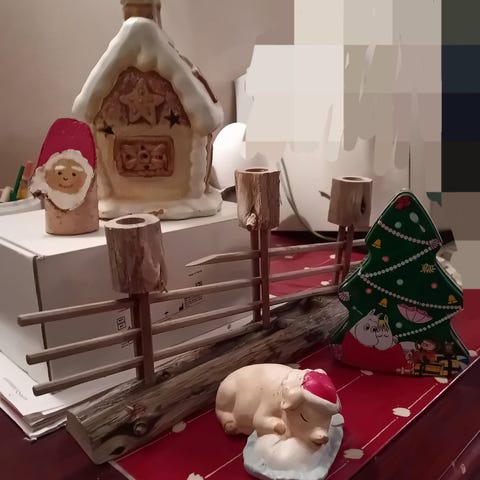 Kaksi Pobratonttua kynttilänjalassa ja yksi tonttu makoilee muuten vain. Yht. 8 e.