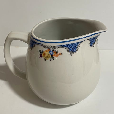 En tiedä kuinka vanha, perintönä saatu. Mitään virheitä ei näy kannussa. Saa tulla katsomaan ennen ostopäätöstä. Ihan söpö, jos kukista tykkää.. ;) Vain nouto.
