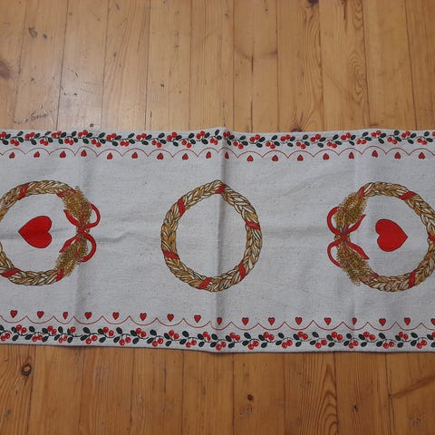 Tämä on pitkä pala, käänteet 3 reunoissa. leveys 46 cm, pituus 495cm. Ollut kappana. Tästähän voi tehdä jotain muutakin. Uudenveroinen puuvilla
