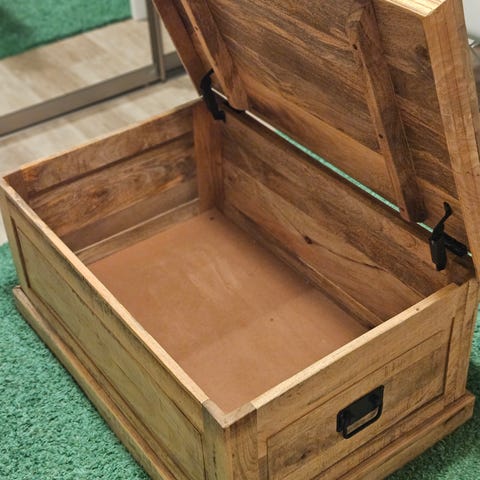 Hyväkuntoinen, rustiikkinen ja jämäkkä tuunattu, vähä erilainen olohuoneen arkkupöytä. Ruosteiset ja kuluneet kulmapalat, nostokahvat, pultit sekä ketjut aitoa käytössä ollutta rautaa sekä 4cm paksun kaksiosaisen pöytäkannen toisen puolen ruostutettua auton korjauspeltiä. Kaikki metalliosat mattalakattu likaantumisen estämiseksi. Mitat 80×80×45. Arkun syvyys kannen alla 35cm.