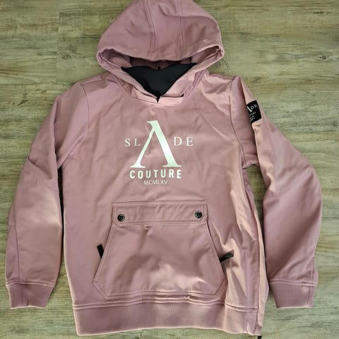Takissa pukemista helpottava vetoketju toisella sivulla. Kypärä mahtuu hyvin hupun alle. Kaksi vetoketjutaskua sivuilla ja yksi kengurutasku. Myös hihassa tasku.