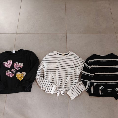 Paitapaketti tytölle koossa 146/152. Kolme lyhyenmallista hupparia ja yksi vähän ohuempi paita, mutta kuitenkin malliltaan samanmoinen vähän lyhyempi. Paidat muuten Kappahlista, mutta harmaa huppari vasemmalla Gap Kids XL (12), mutta vastaa siis mielestäni hyvin tuota 146/152 kokoa. Siinä vähän jo nyppyä/nukkaa pinnassa.