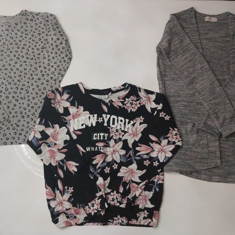 Lyhyenmallinen paitapaketti tytölle koko 146/152. Vasemmalla Lindexin collegepaita, keskellä H&M collegepaita (kokomerkintä 158, mutta aika samaa kokoluokkaa muiden kanssa) ja oikealla H&M neulepaita. Käytettyjä, mutta vielä ehjiä ja siistejä toisellekin.