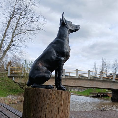 Ainutlaatuinen dobermannin veistos, joka on valmistettu kuparista ja betonista.