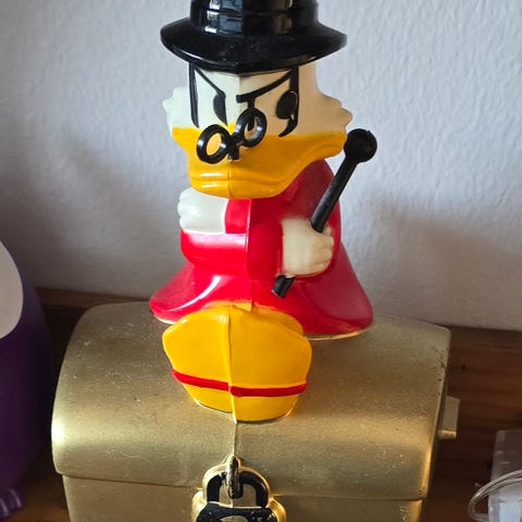 Myydään Roope Ankka säästölipas. Lippaassa kulumaa, silmälasit ja keppi puuttuvat. Ei avainta.