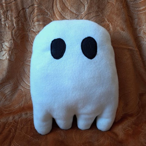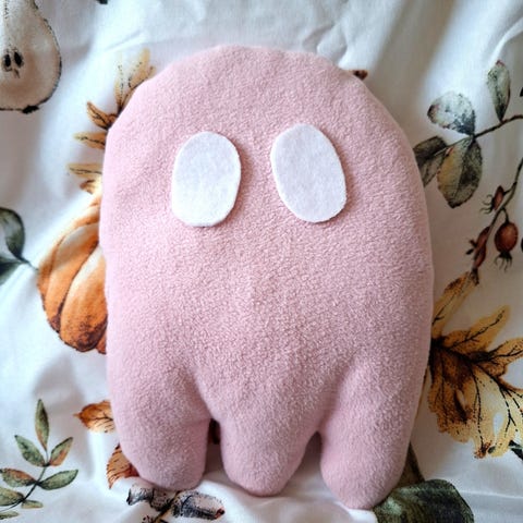 Vaaleanpunainen/valkoinen kummitustyyny/pehmo Halloweeniksi, uusi, vanutäyte. Silmät silitetty kiinni, vain paikallispesu. Tehty 99% kierrätysmateriaalista. Korkeus noin 29cm.