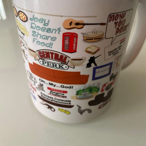 4 kappaletta Frendit-sarjasta tuttuja mukeja myynnissä. Korkeus noin 7 cm, halkaisija 6 cm. Mukin tilavuus reilu desilitra. Kunto erinomainen! Hinta 15€/4kpl