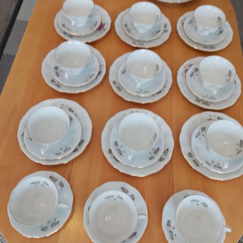 Kahvikupit ja lautaset kuudelle henkilölle, Smielow Puola. Settiin kuuluu kahvikuppeja, alus- ja kakkulautasia, kannellisen sokerikon ja kermakon. Setissä joissa on vihreä lehtikuviointi ja kullanväriset reunukset. Astiat ovat posliinia ja sopivat kahvin tarjoiluun. Sokerikon kork 10 cm, halk. n. 8 cm. Kermakon kork. 9,5 cm. aluslautasen halk. 13,5 cm, kakkulautasen halk. 17 cm. Kupin kork. n. 7 cm, halk. 7,5 cm.