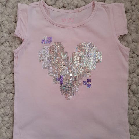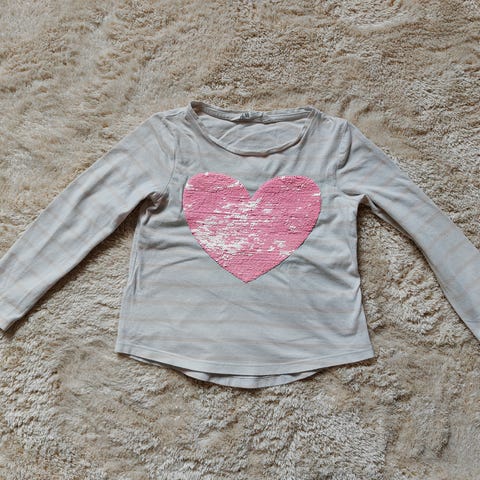 Myydään H&M paita olkapäillä röyhelöt, kokolappu leikattu pois mutta vastaa n.104cm. Siistikuntoinen.