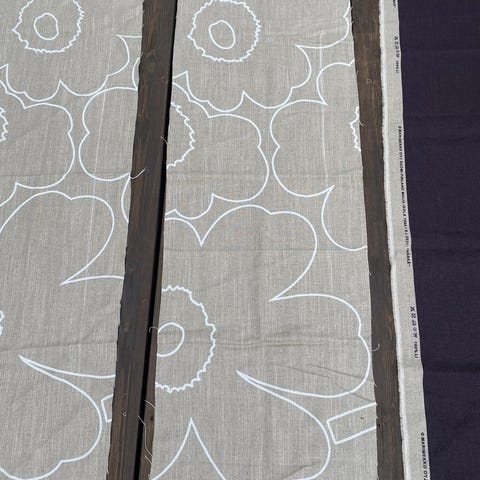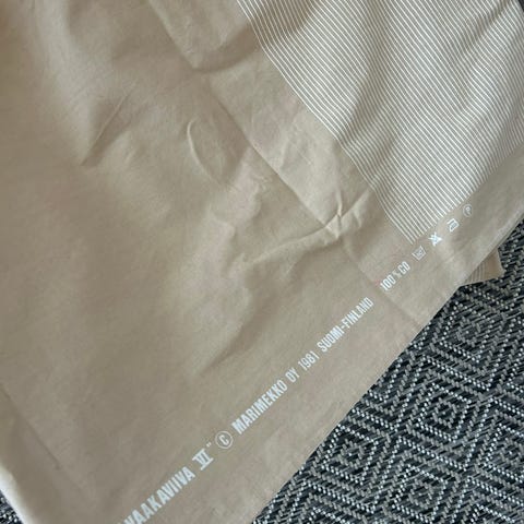Jäänyt käyttämättä, painava rouhea kuosi. Pöytäliinana, seinätekstiilinä,rahdin päällisenä yms. Pellavaa. Väri on mielestäni kaksi ruskeaa. Lähikuva tekee turhan lilan väriseksi. Koko 190x140.