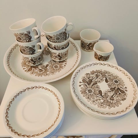 Arabian Elina kahviastiasto: 9 kpl kahvikuppi,12 kpl aluslautanen, 12 kpl leivoslautanen, 1kpl sokerikko, 1 kpl kermakko, 1 kpl tarjoilulautanen