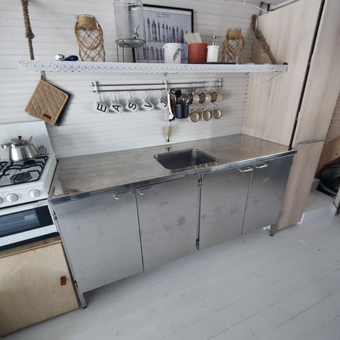 Kokopuinen allaskaappi entisöitäväksi. Leveys 118 cm, syvyys 63 cm ja korkeus 74 cm.