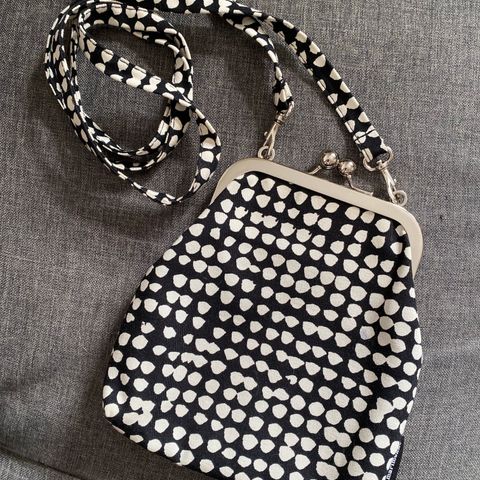 Marimekon harmaavalkoinen kukkarolaukku olkahihnalla.