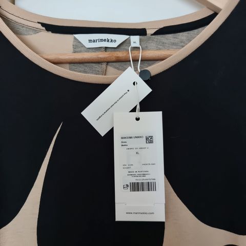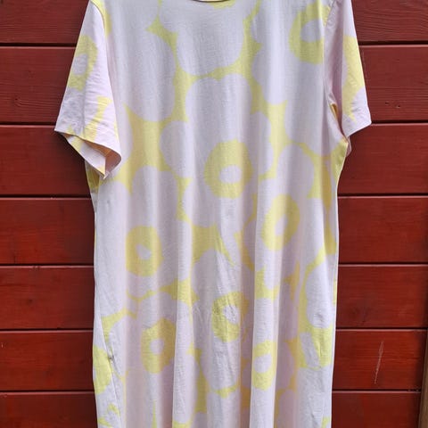 Käytetty, pesty useasti. Pinnassa pesuhahtua, joka näkyy läheltä katsoen mustassa osassa. En silittele enkä teippiharjaile pahemmin vaatteita. Saattaa lieventyä niitä käyttäen. Koko XXL. Kaikai 59, olka helma noin 110cm. Vastaa kokoaan ha hieman joustaa trikoo kun on. Pohja harmaa. Yleisilme kauempaa ihan perussiisti. Ilmeisesti kollineaari unikko mallin nimi. Tässä ilmeisesti ollut alunperin vyö, sitä ei ole enää. Mmm