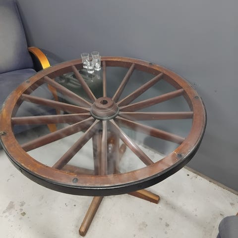 Pöytä joka tehty kärrynpyörään. Pöytä pyörii ja jalat on terästä. Taso savulasia. Reunoilla käytön jälkiä lasissa.