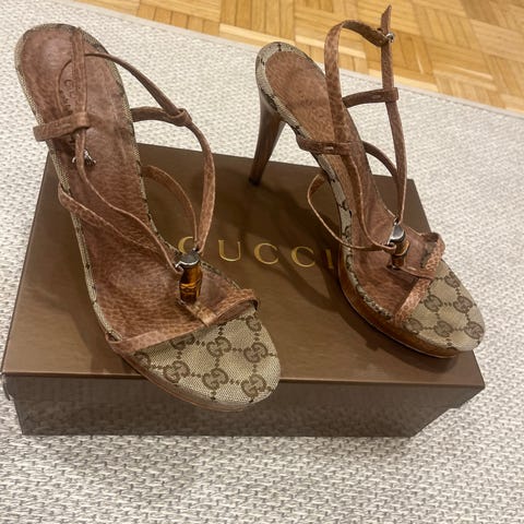 Kauniit vähänkäytetyt Gucci korkokengät. Mokkanahkaa, kultaiset yksityiskohdat. Laatikko ja dustbag mukaan.