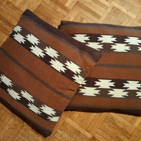 Ruskeat kuviolliset boho/vintage tyyliset kelim tyyliset koristetyynynpäälliset 2 kpl. Merkki H&M Home. Etupuoli paksua kudottua puuvillaa, takapuoli yksiväristä puuvillakangasta. Takana vetoketjut. Sopii 50 x 50 cm kokoisiin tyynyihin (tyynyt eivät kuulu kauppaan mukaan). Ehjät ja siistit.